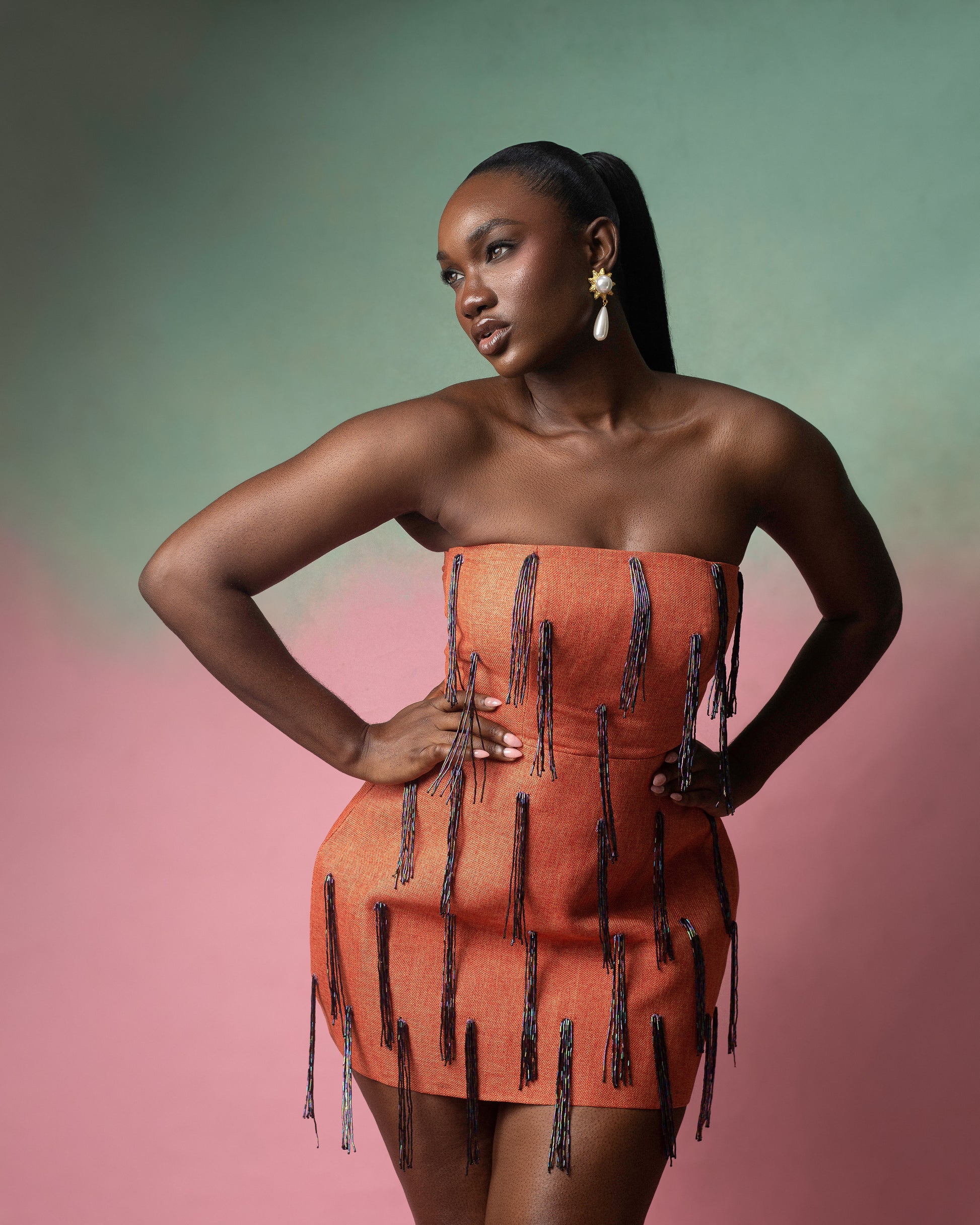The Tariebi Dress is a celebration of craftsmanship and glamour. Where sharp structure meets dazzling detail, this showstopping piece commands attention. The interplay of glistening glass beads against the rich, textured tweed creates a striking contrast — a bold statement of elegance and power. It’s no wonder the Tariebi remains a coveted bestseller.